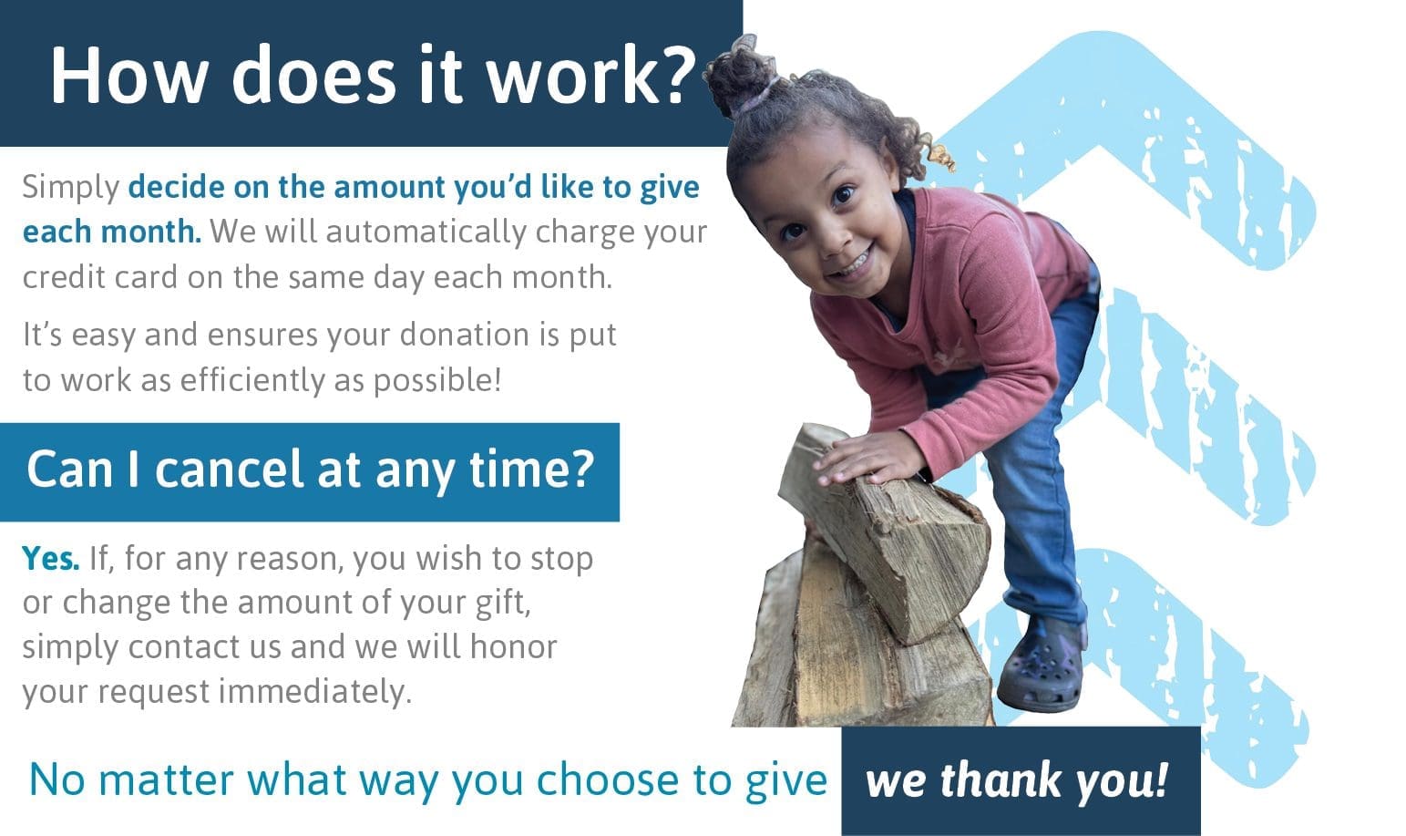 Simply decide on an amount you’d like to give each month. We will automatically charge your credit card. It’s easy and best of all it ensures your donation is put to work as efficiently as possible!