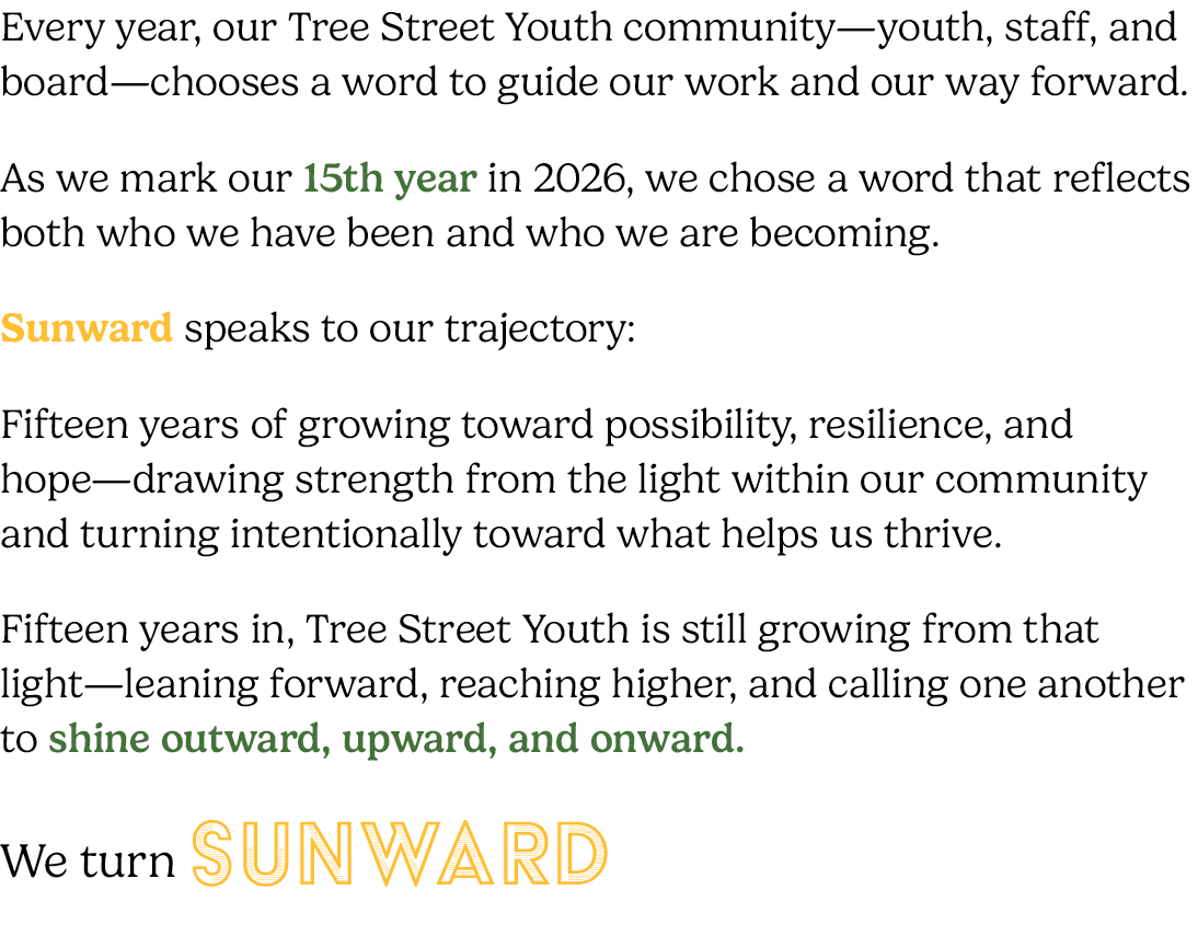 If these stories inspire you, please consider supporting Tree Street Youth with a contribution of any amount that helps our programs continue to grow and our youth to shine.